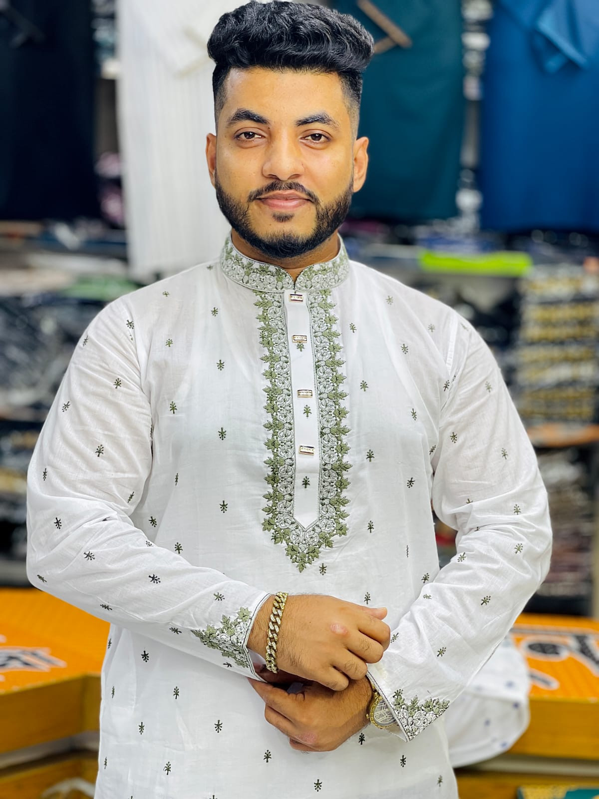 চমৎকার এমব্রয়ডারি: এই পাঞ্জাবিটির কলার, বুক এবং হাতায় রয়েছে চমৎকার এবং জটিল এমব্রয়ডারির কাজ, যা আপনার পোশাকে একটি গ্ল্যামারাস লুক যোগ করে এবং আপনাকে করে তোলে অন্যদের থেকে আলাদা।